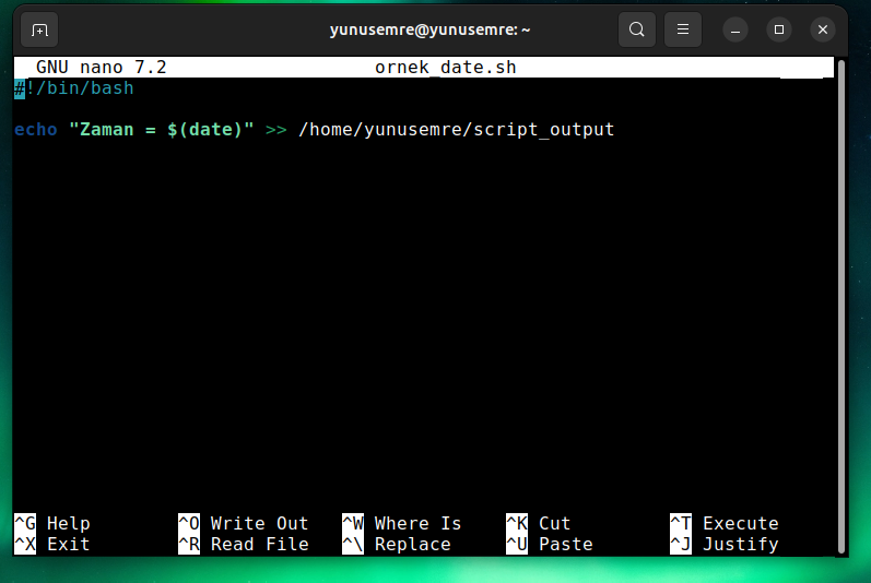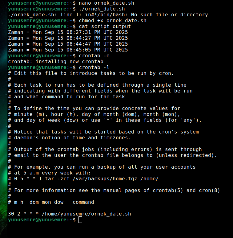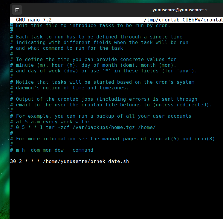 Girdiğimiz 30 2 * * * /home/yunusemre/ornek_date.sh komutu ile beraber her gün saat 2.30’da bu scripti çalıştıracak şekilde örneğimizi de tamamlamış olduk.