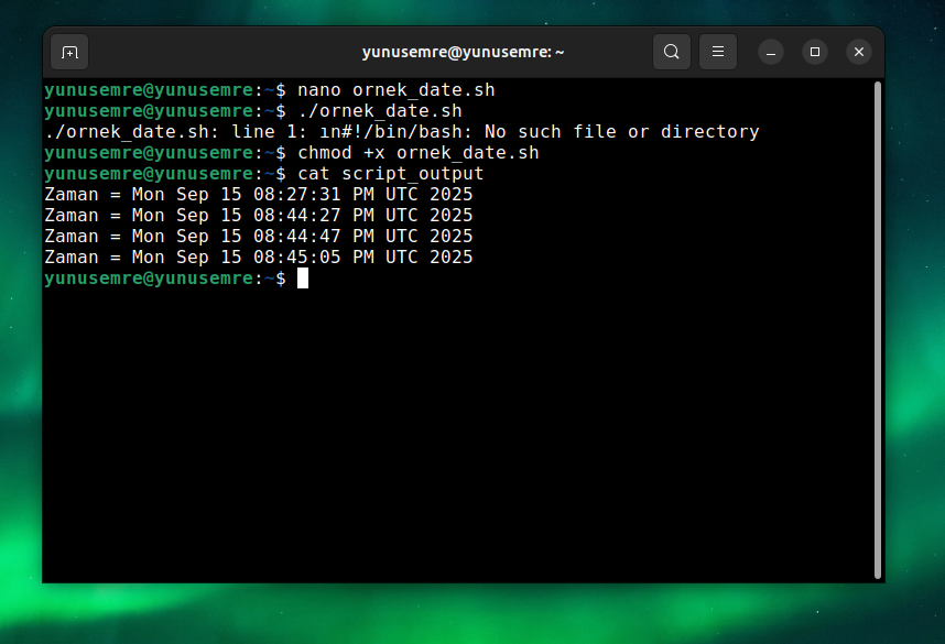 Burada nano ile bir script yazdım zaman scripti bunu daha sonra aşağıda göreceğiniz şekilde scripti çalıştırıyoruz öncesinde chmod ile yetkilendirme yapmamız lazım.