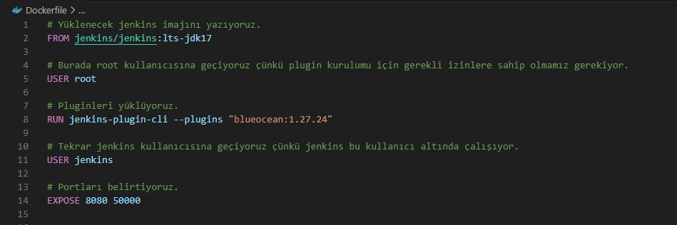 Öncelikle işlemleri VS Code üzerinden gerçekleştireceğiz. Öncelikle bir Dockerfile yazmalıyız; bunu aşağıda gösterdiğim ve açıkladığım şekilde basitçe oluşturabiliriz. Ardından IDE’nin yardımıyla Docker imajını build edip çalıştırabiliriz