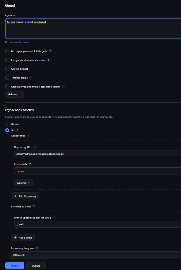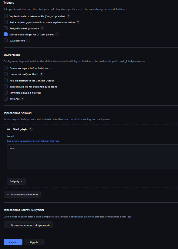GitHub eklentimizi yükledikten sonra karşımıza aşağıdaki gibi bir sayfa gelecek. Burada açıklama ve yapılandırma alanlarının yanı sıra trigger kısmını da görebilirsiniz; işlemi nasıl tetikleyeceğimizi buradan belirleyebiliriz. Ben alt kısma bir shell script ekledim ve script’in date çıktısını görmeyi bekliyorum