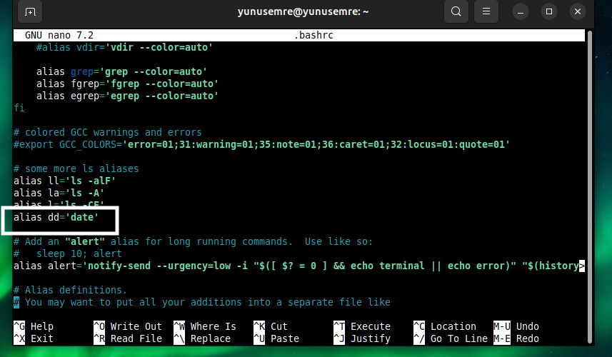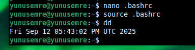 Daha sonra nano ile düzenlediğim .bashrc dosyamı mevcut shell ortamına uyguluyorum ve çalıştırdığımda artık date olarak tanımdalığımız komutu dd yazarak çalıştırabiliyorum.